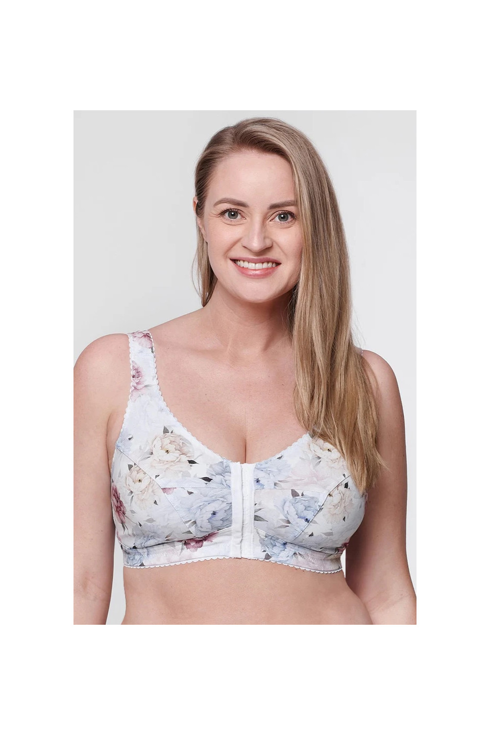 Εξαιρετικά άνετο σουτιέν χωρίς μπανέλες που κουμπώνει μπροστά με κόπιτσες. Είναι κατασκευασμένο από μαλακό βαμβακερό πιστοποιημένο ύφασμα με φλοράλ σχέδιο και σχεδιασμένο για να δείχνει το στήθος μικρότερο χάρη στο minimizer effect, ενώ εξακολουθεί να κολακεύει. Το σουτιέν είναι κατάλληλο για γυναίκες, που έχουν ευαίσθητο δέρμα και αναζητούν μια αίσθηση απαλότητας στο δέρμα τους όλη την ημέρα. Ιδανικό εσώρουχο για τον ύπνο και για όλες τις δραστηριότητές σας.