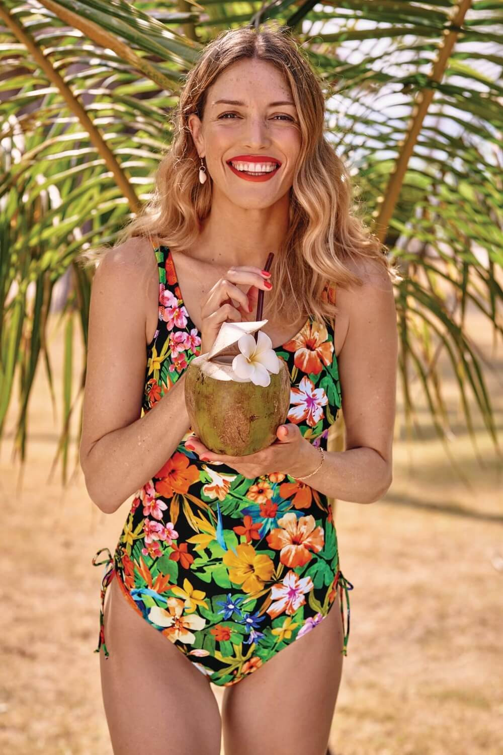 Ένα ολόσωμο μαγιό χωρίς μπανέλες γεμάτο λουλούδια στο σχέδιο. Με κορδόνια που σουρώνουν στα πλαϊνά και ρυθμίζετε εσείς το ύψος
