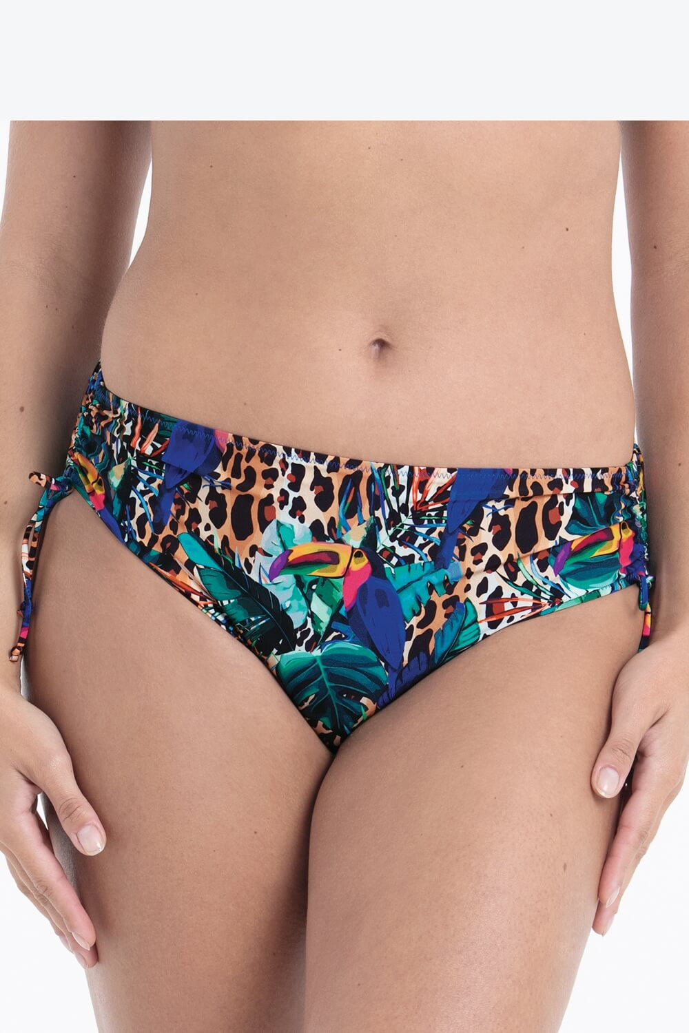 Άνετο bikini σλιπ σε εντυπωσιακό πολύχρωμο print. Διαθέτει ρυθμιζόμενα κορδόνια στα πλαϊνά, ώστε να προσαρμόζεις το ύψος στο πόδι και να πετυχαίνεις την εφαρμογή που σε κολακεύει.