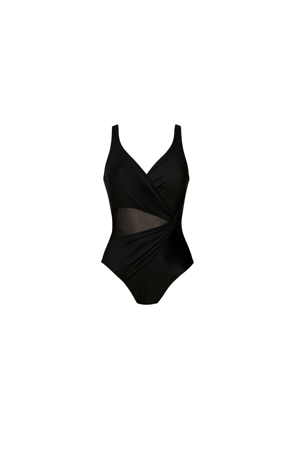 Κομψό ολόσωμο μαγιό χωρίς μπανέλες από ΄ύφασμα ανθεκτικό σε ντραπέ σχέδιο με τούλι