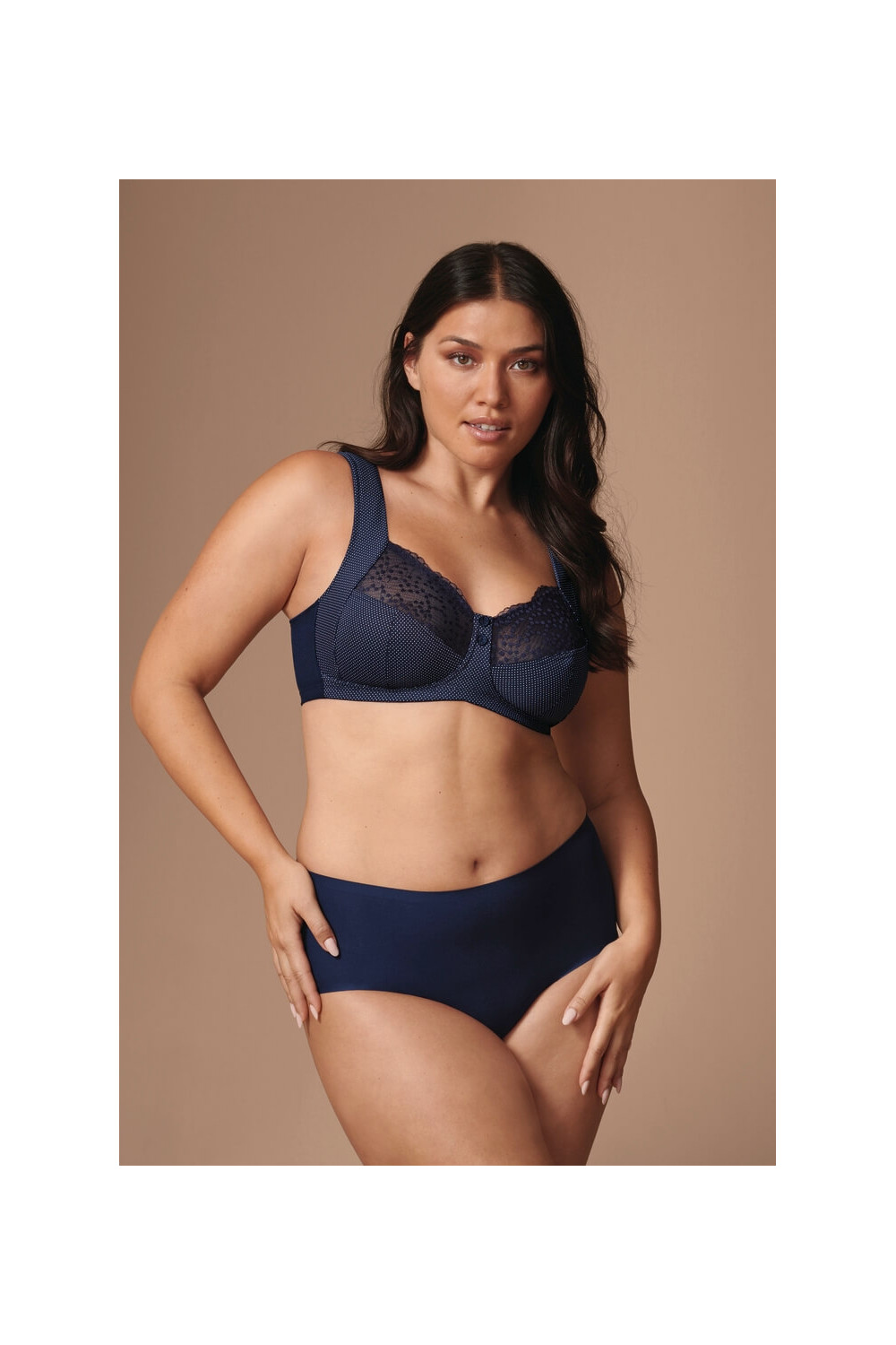 Το εξαιρετικά λειτουργικό ελαστικό ύφασμα μικροΐνας, που χρησιμοποιείται για τις θήκες τριών τμημάτων, εγγυάται τέλεια στήριξη μέχρι και σε θήκη H. Το σουτιέν αυτό προσφέρει την απόλυτη άνεση. Το ελαφρώς τοξωτό τρίγωνο στην περιοχή της κοιλιάς, που αποτρέπει την πίεση στο διάφραγμα, οι ενισχυμένες τιράντες και τα τμήματα από τούλι Power στο πίσω μέρος, ανακουφίζουν από την καταπόνηση.